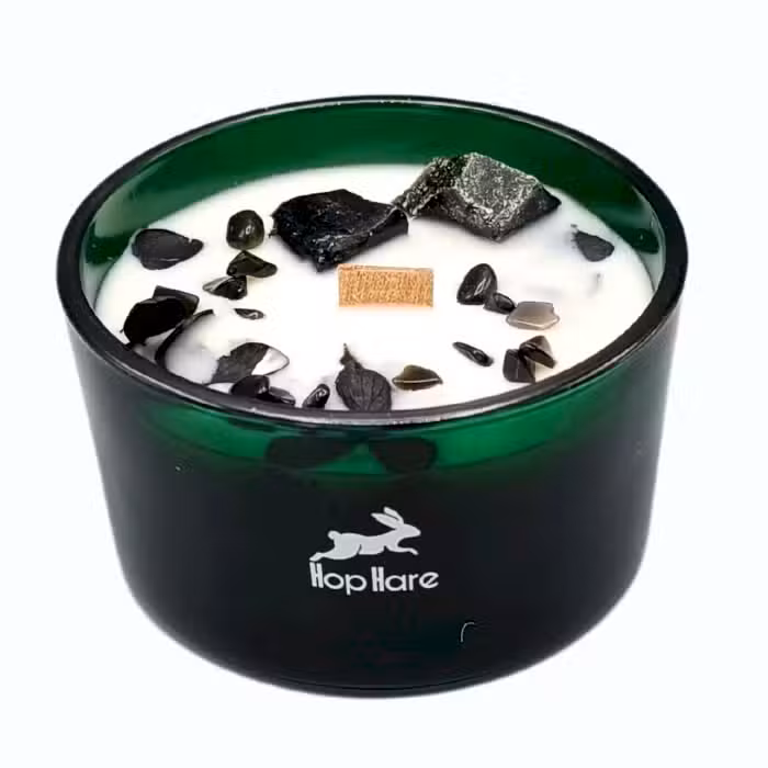 Vsaka čarobna sveča Hop Hare Crystal Magic Candle, zaprta v temno zeleni stekleni posodi z rustikalnim lesenim stenjem, je edinstvena mojstrovina. Odkrijte čarobnost v sebi, ko odkrijete dragi kamen, skupaj s posipom manjših koščkov dragih kamnov, ki ustvarjajo bleščeč prikaz naravnih čudes. Bistvo teh sveč še dodatno poudarjajo nežni suhi cvetovi.